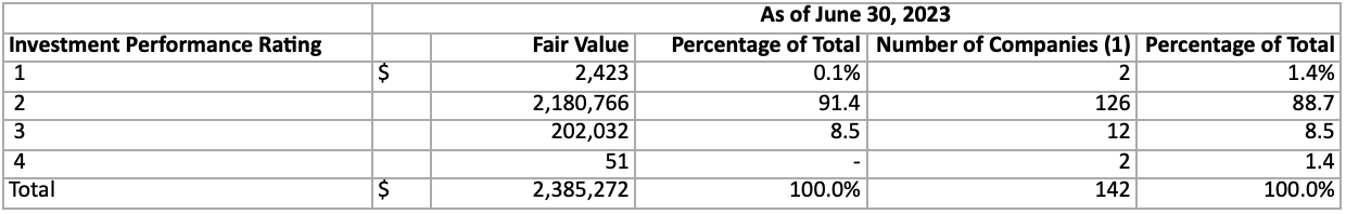 Credit quality was stable quarter-over-quarter. Within our internal risk rating scale, 91% of our portfolio as of June 30 was comprised of risk rating 1 and 2 investments, indicating that the company was performing in line, with or better than expectations relative to our initial underwriting. Risk rating 3 investments comprised 9% of our portfolio at fair value. These investments reflect companies that have been impacted by inflationary impacts and rising interest rates. We remain focused on watching these companies closely. Risk ratings 4 investments comprise 0% of our portfolio at fair value and included 2 portfolio companies on nonaccrual. No new investments were added to nonaccrual during the quarter.